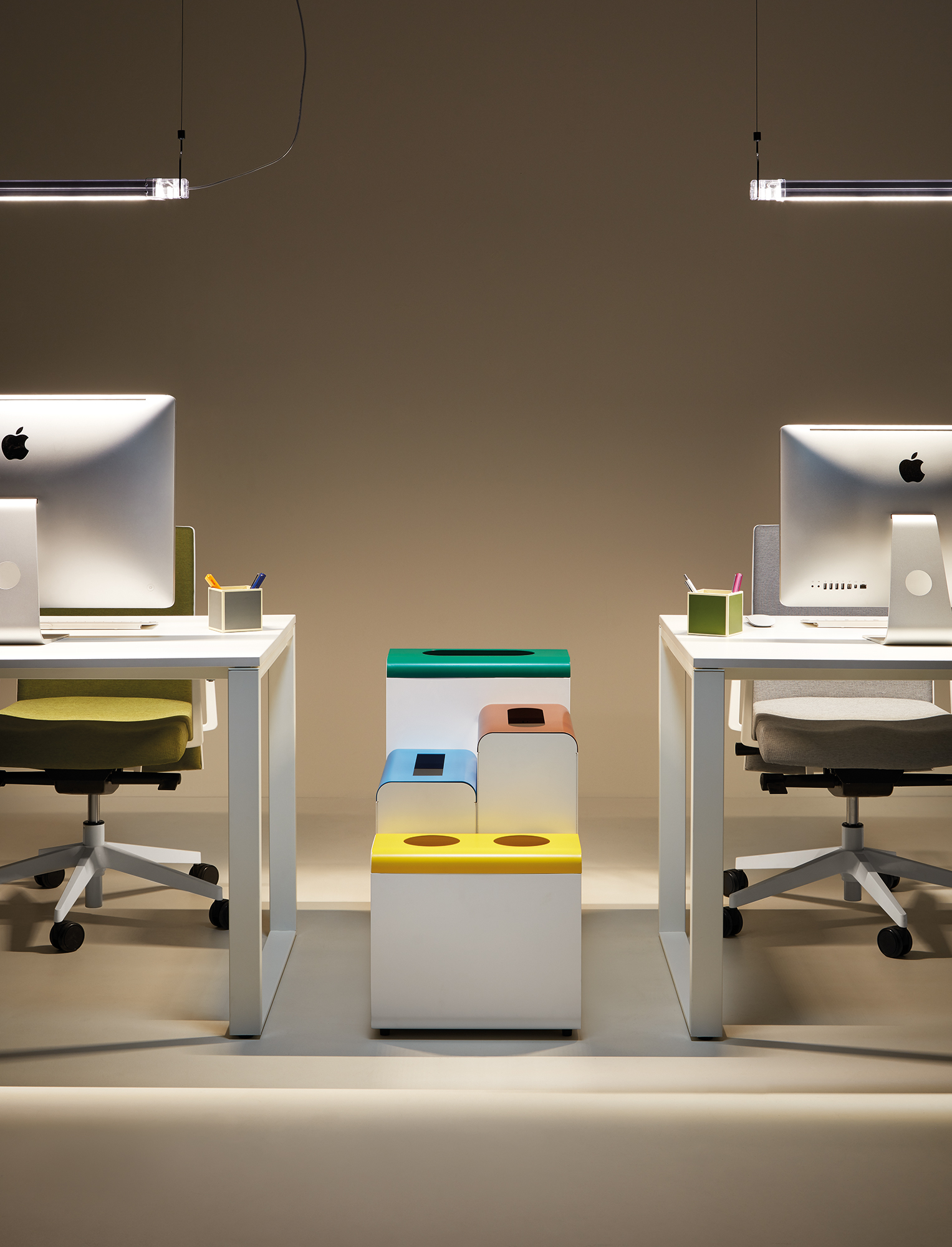 Un conjunto de contenedores de reciclaje que vestirá cualquier espacio, atraerá la vista de quien pase por delante por su simpatía. Fabricado en chapa de acero lacada,con un cabezal extraíble, de color y forma que determinará el residuo.