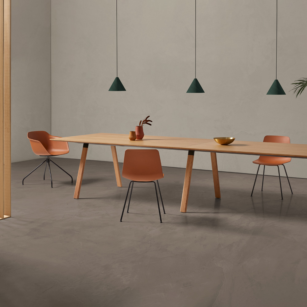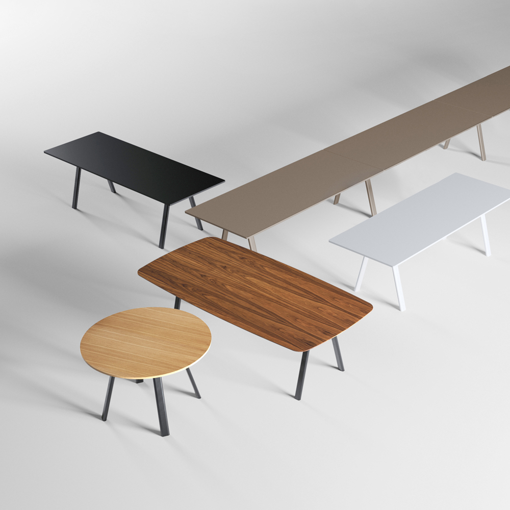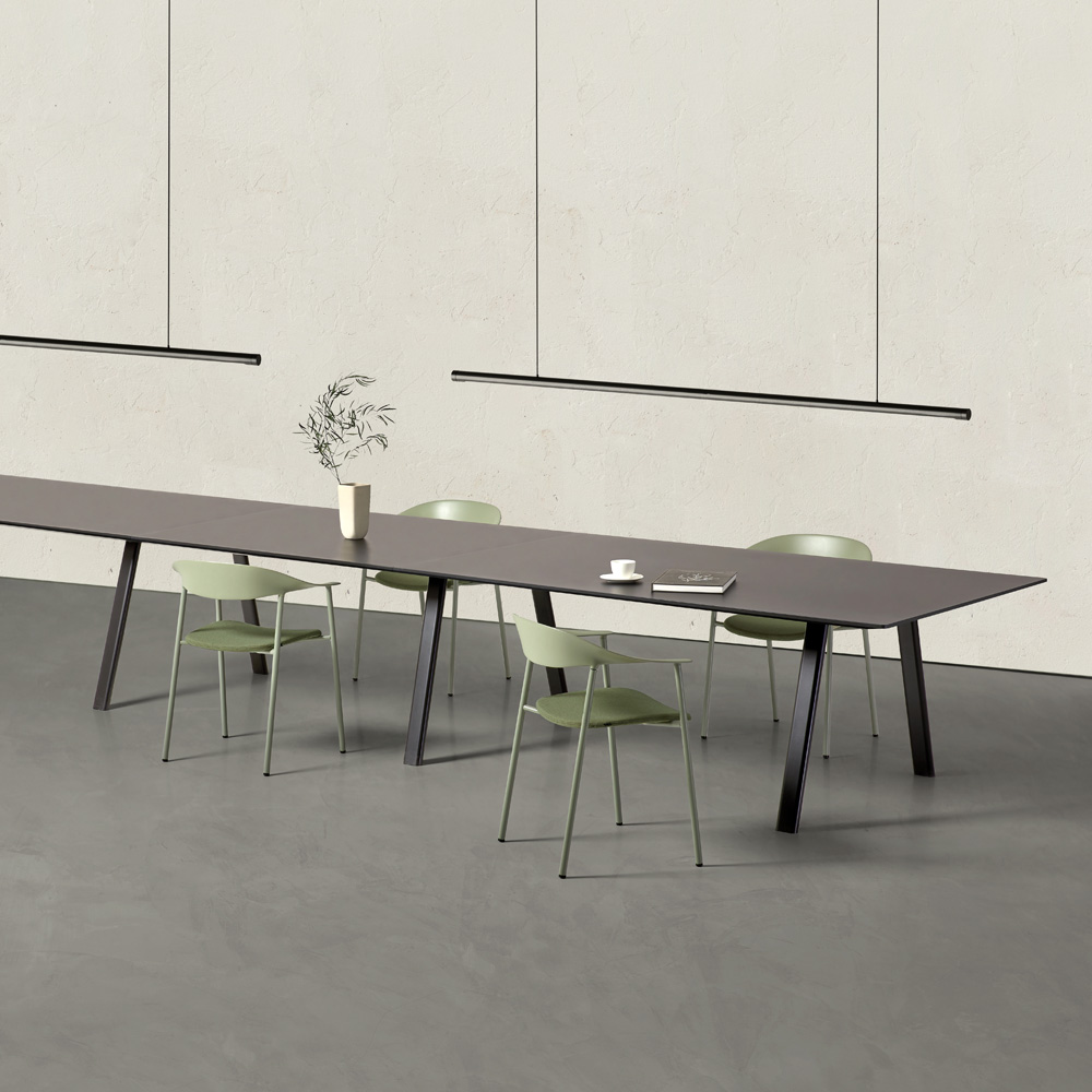 El sistema PLANIA incluye una amplia gama de opciones que se adaptan a diferentes necesidades. Ofrece mesas individuales en diversas medidas y configuraciones, así como mesas modulares de gran formato. Estas últimas cuentan con encimeras seccionales que permiten crear superficies amplias y continuas, alcanzando dimensiones prácticamente infinitas. Este diseño innovador es ideal para salas de reuniones, áreas colaborativas o espacios multifuncionales que requieren combinar practicidad con estilo.
