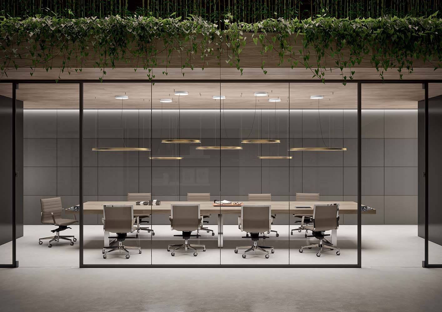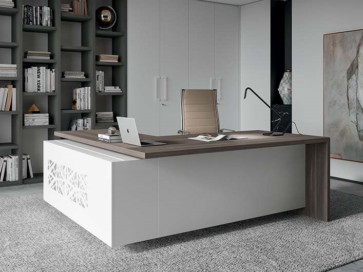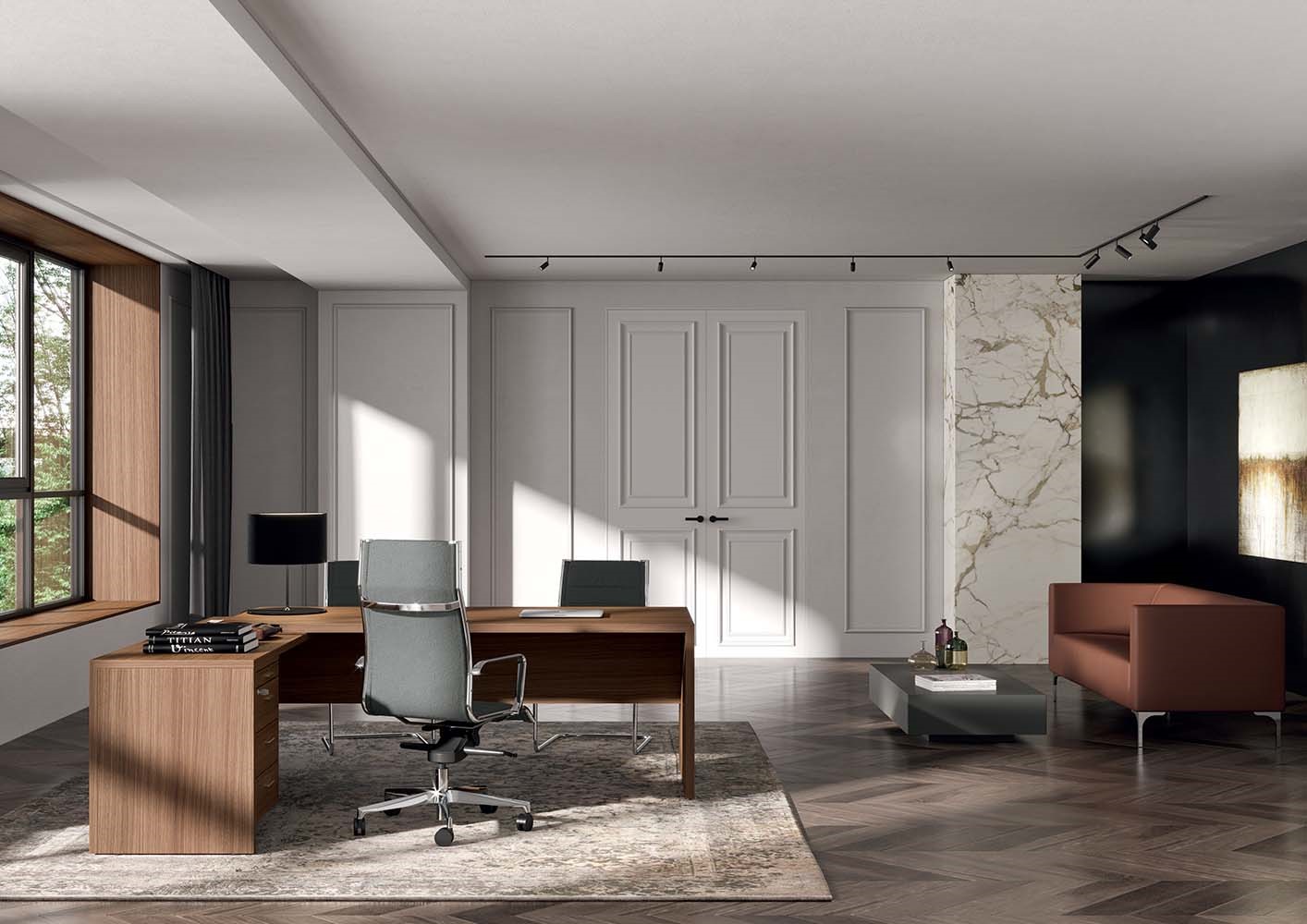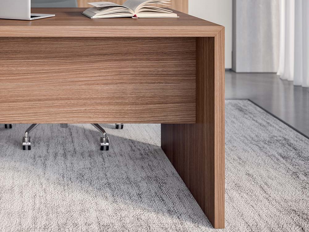 El modelo puede declinarse en estaciones de trabajo individuales , escritorios con faldón integrado, mesa con tablero estructural y soluciones con armario o caja multiusos, para dar forma a toda idea de confort y estética. La superficie siempre está ordenada y despejada gracias a los accesorios funcionales, como las bandejas portacables, que ayudan a mantener un aspecto sobrio.