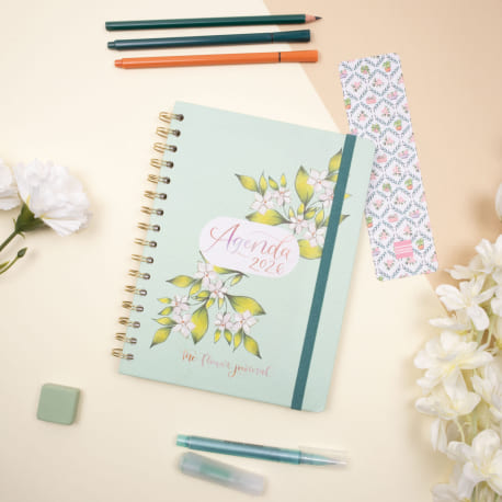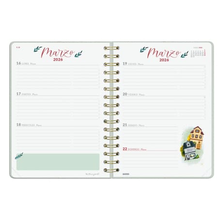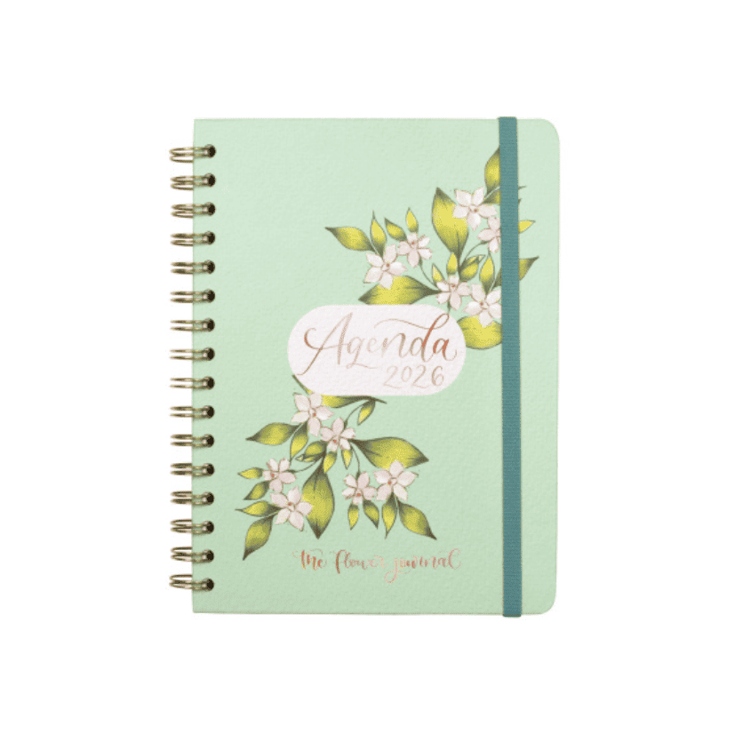 La AGENDA 2026 VERDE FLOWER cubre el periodo enero – diciembre 2026, con un interior de semana vista horizontal, ideal para ver de un solo vistazo tu semana completa: citas, tareas, proyectos y notas importantes. Su espiral doble metálica permite que la agenda permanezca completamente abierta, y la goma elástica asegura que nada se salga cuando la llevas en el bolso o mochila.