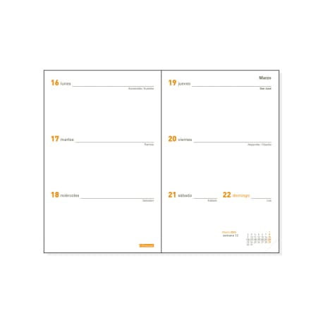 Su interior presenta un diseño de semana vista horizontal, ideal para quienes quieren tener de un solo vistazo la organización de la semana: citas, tareas, recordatorios y proyectos, todo en una página compacta y práctica.