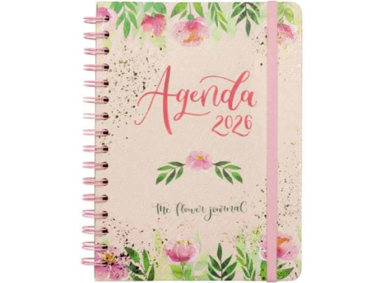 Este modelo presenta un tamaño compacto de aproximadamente 155 × 212 mm (formato E10), ideal para llevar en el bolso o colocar en el escritorio sin ocupar demasiado espacio. La tapa dura está forrada con peliculado mate antirrayaduras y presenta un diseño moderno (disponible en varios colores como el rosa), aportando una estética cuidada. La encuadernación en espiral permite abrir la agenda completamente plana, lo que mejora la comodidad a la hora de escribir. Incluye detalles como goma de cierre, esquinas microperforadas para localizar rápidamente la semana o el día, y adhesivos temáticos para personalizar eventos.
