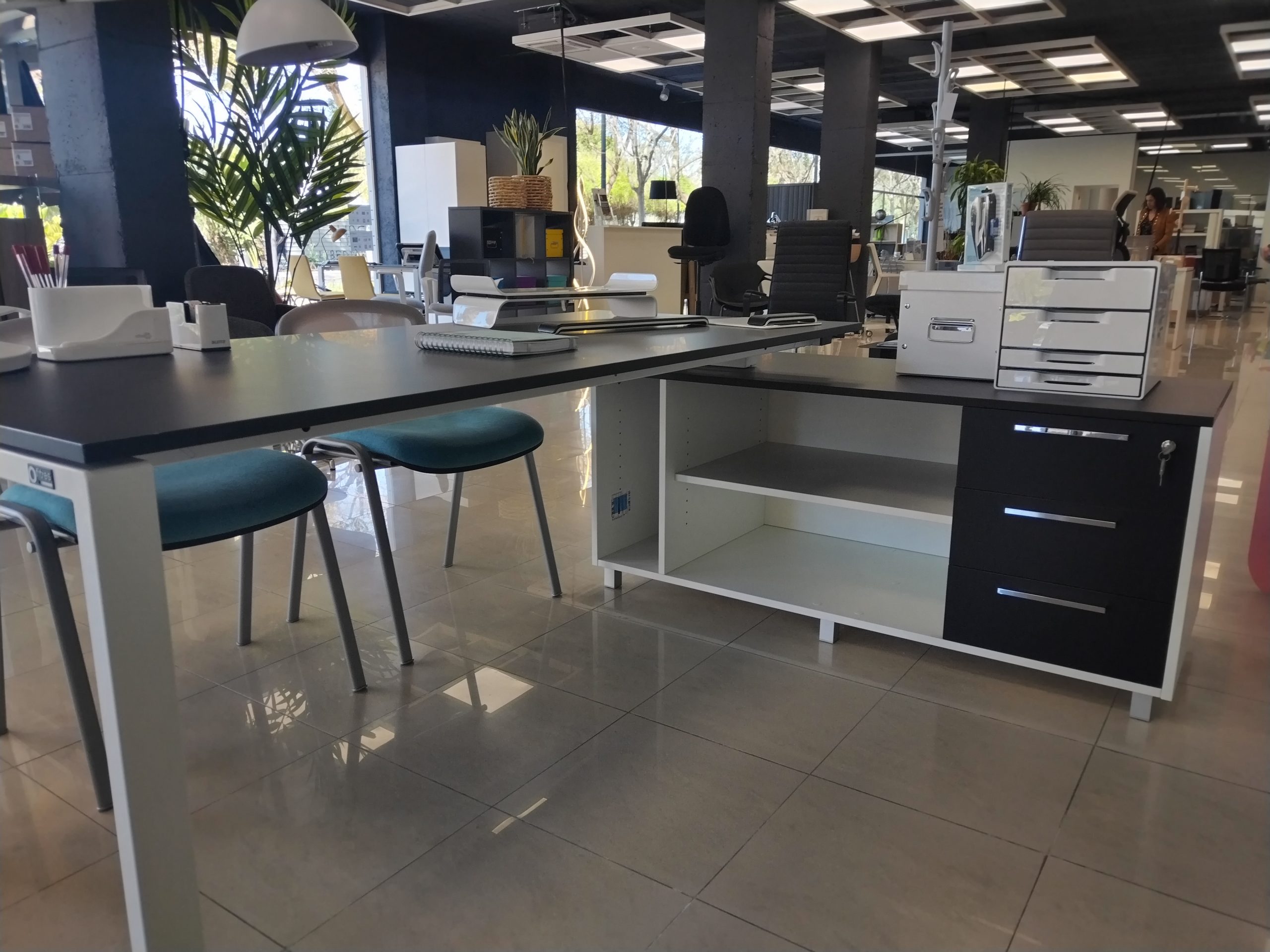 Mueble CREDENZA 140x60x56cm de estructura blanca con encimera y frontales de los 3 cajones de color Negra Zenit super Mate