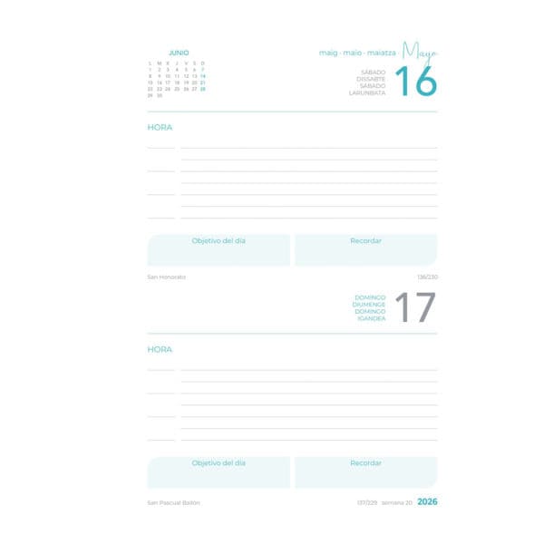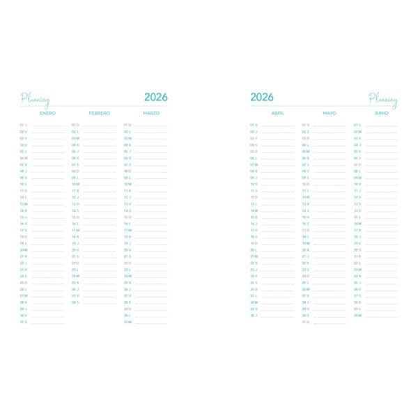 La AGENDA 2026 FANCY AZUL está diseñada en día por página (D/P), ofreciendo una hoja completa para cada día laborable del año. Esto te permite anotar con amplitud reuniones, citas, tareas, objetivos y recordatorios sin sentirte limitado por el espacio. Los fines de semana comparten página, manteniendo la estructura clásica de planificación equilibrada.