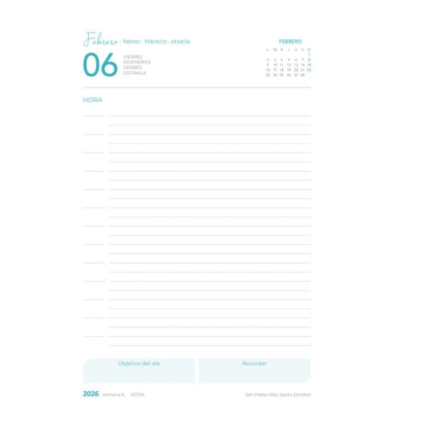 Todo ello impreso sobre papel blanco FSC® de 70 g/m², que garantiza una escritura agradable y un producto responsable con el medio ambiente. Su encuadernación cosida permite un uso intensivo durante todo el año sin que la agenda se deteriore, ofreciendo durabilidad y comodidad al escribir.
